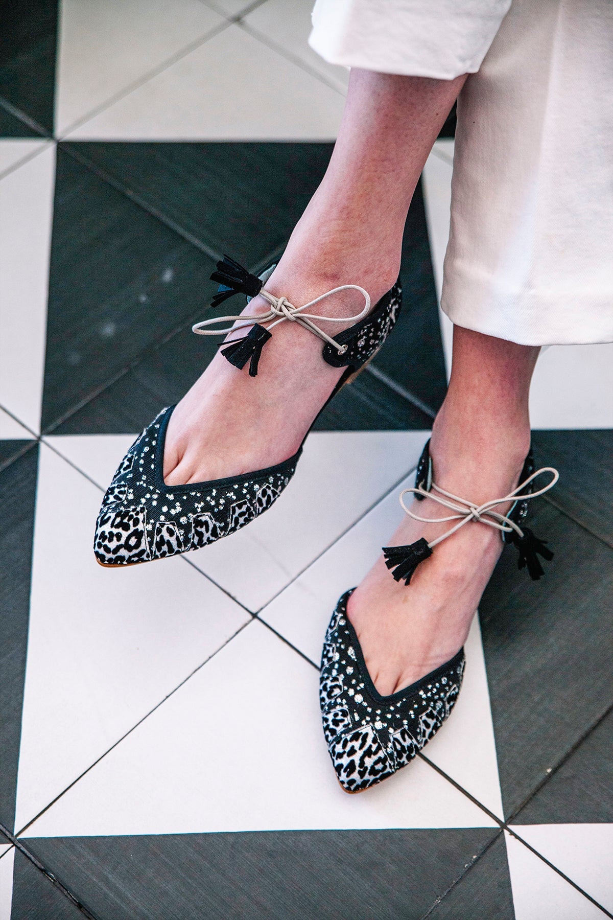 Bailarina con base de rejilla y piezas de animal print a contraste plata y negro. Cordón redondo beige con borla a juego.
