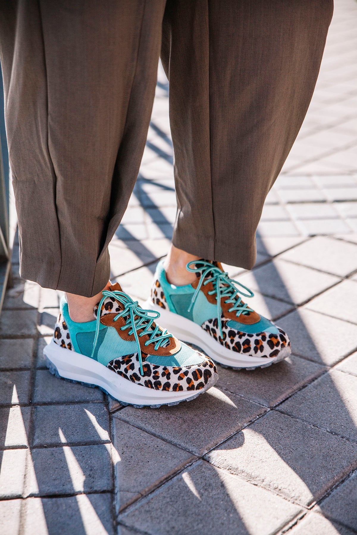 Zapatilla running con estampado animal print, tejido técnico y ante. Interior de piel. Made in Spain. Todos nuestros modelos poseen una cuña interna de 1,5 cm. Interior 100% piel. Suela de cuero. Modelo exclusivo de Defloresyfloreros, diseñado y fabricado en España.