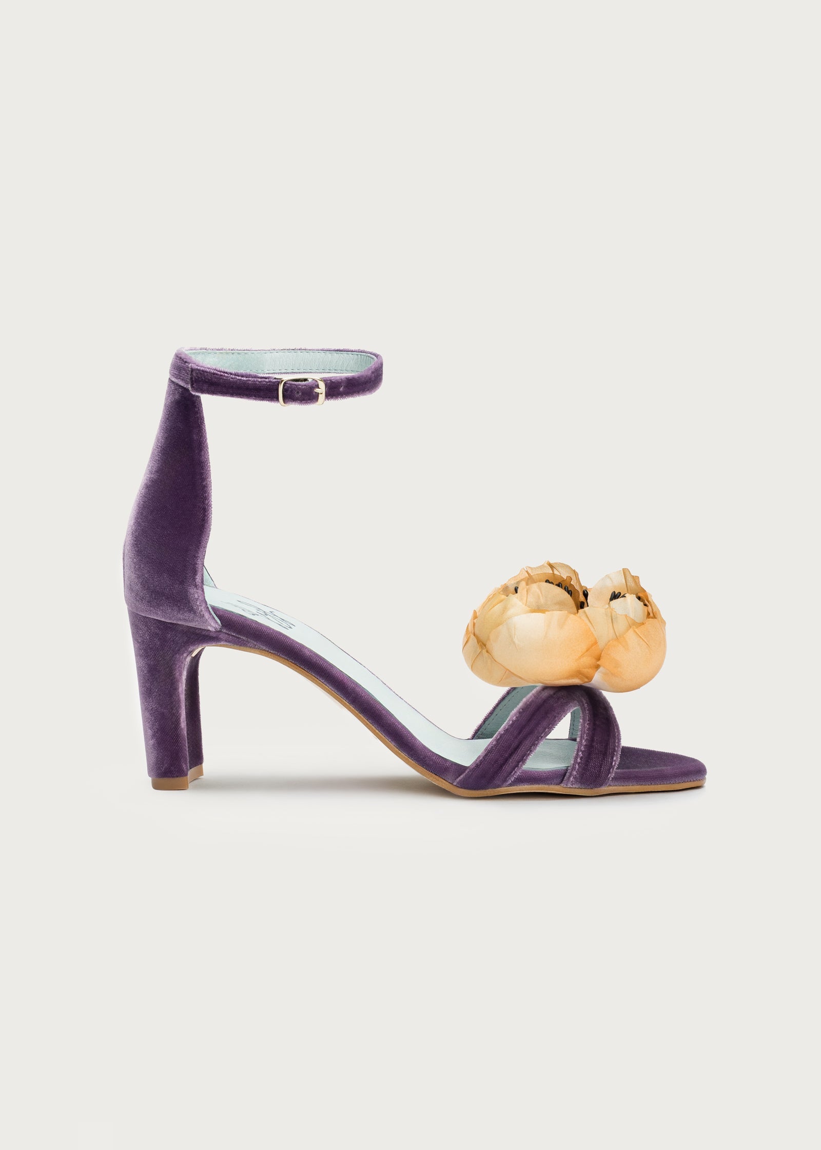 Sandalia de terciopelo de seda, con tacón de 6,5 cm. de altura, pulsera en el tobillo y tiras cruzadas en pala.