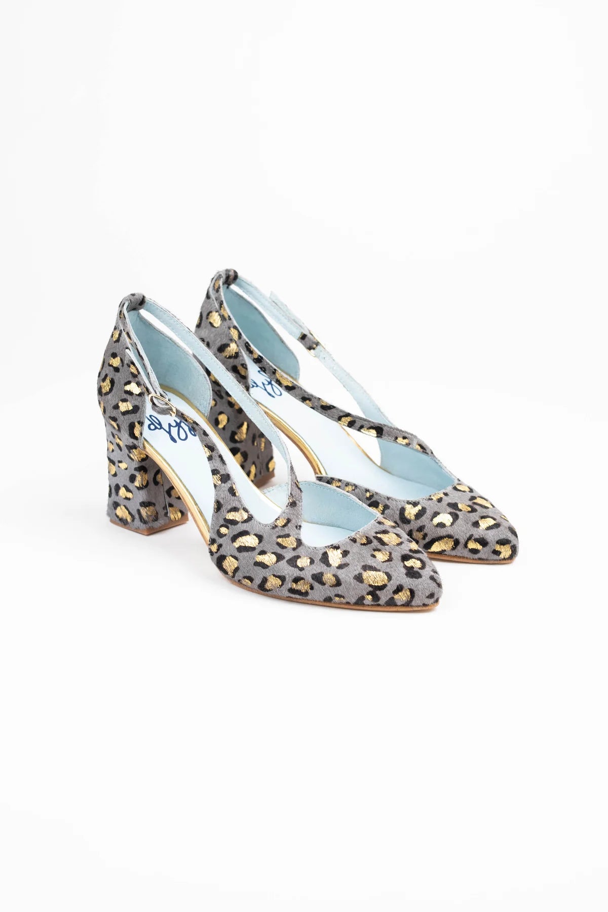 Kiev Gold es uno de los diseños clave de la temporada: un tacón de piel de potro en color gris, con estampado de animal print en negro y dorado. Presenta aberturas estratégicas y pulsera con hebilla lateral, que definen su elegante línea. Su tacón ancho y robusto es, sin duda, el sello de identidad de Kiev. Le confiere confort, pero sobre todo: carácter.