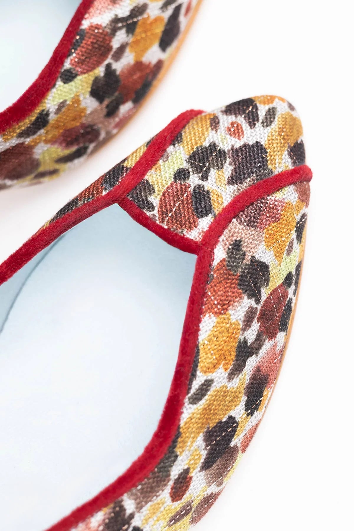 Munich Viena es un clásico salón en arpillera estampada en marrones, granates y ocres. Este diseño presenta cuatro piezas muy bien diferenciadas: puntera, laterales y talonera, todos divididos por ribetes de terciopelo, que le confieren una línea muy elegante y una trasera distinguida.